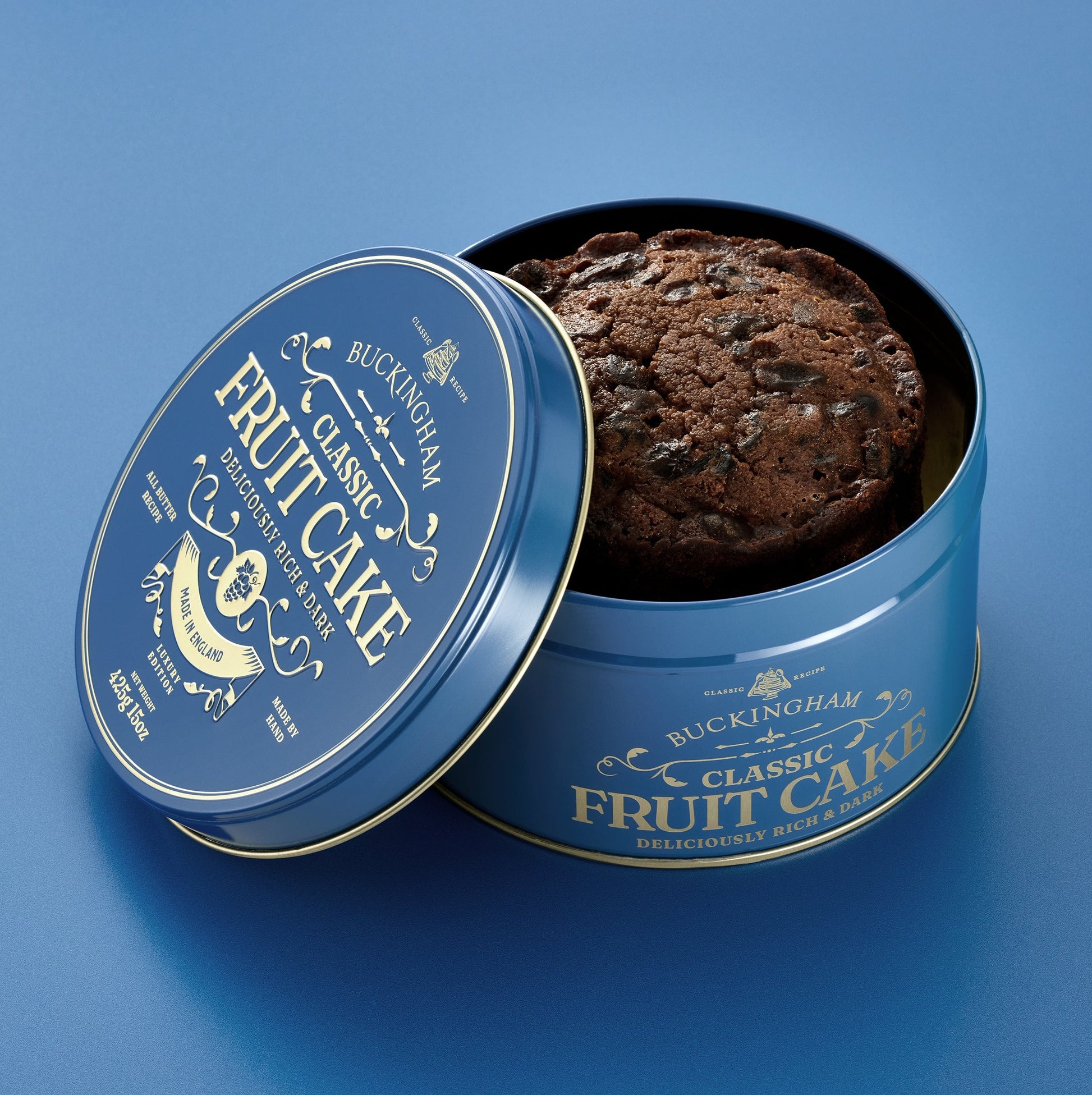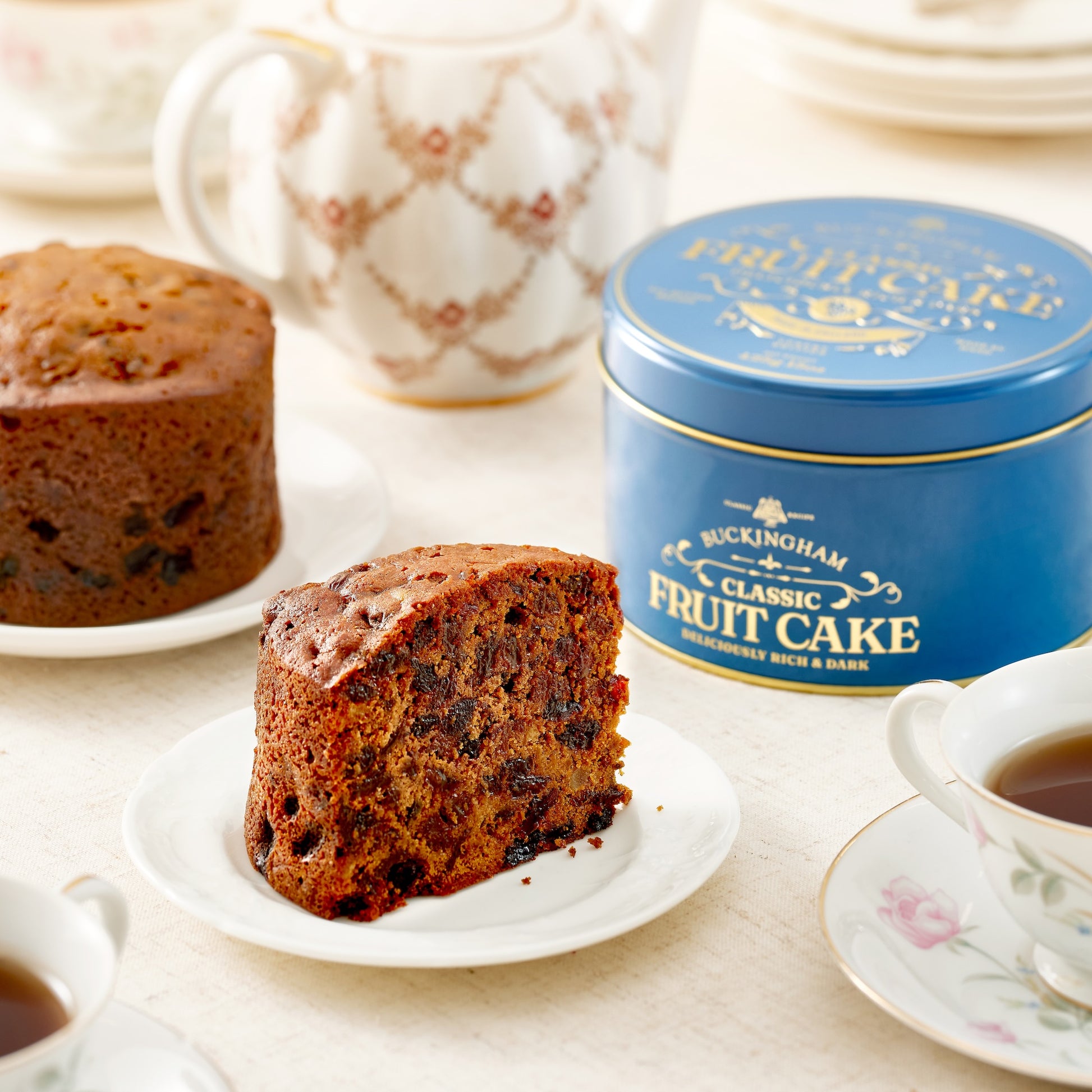 Our best-selling Classic English Fruit Cake in a tin, with the original Buckingham® recipe, with over 45% real fruit. This is where it all started. We've never changed our traditional fruit cake recipe, and it's still our most popular small-sized alcohol-free fruit cake to buy online. A classic Christmas fruit cake in a beautiful vintage-style gift tin is a perfect present for luxury food lovers.